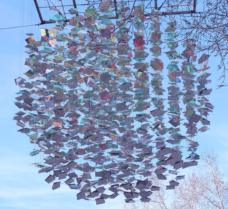 Rather than completing the full walk through Prince’s Island, I only walked as far as the stage area that has been set up for public events on the Island. I walked back the way I came, over the small bridge that leads to this little oasis. Before I left the Bow River area, I walked across the road towards some high-rise residential blocks to establish what the colourful reflections were that were starting to shine in the late afternoon sun. What I was looking at was an art piece that was strung over the entrance to the gardens of a particular block. I am sure the local children would have been almost as fascinated as I was.