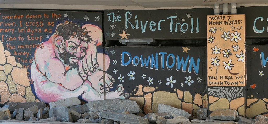 This beautiful, streamlined bridge opened for use in March of 2012. The structure of the bridge is a helical steel structure that shoots straight across the river with no pylons going down to the river to reduce its ecological footprint. One of the requirements for the build was that it could withstand the one in a hundred year flood cycle. I decided I needed to try out this bridge over the snow filled Bow River and I could see there was another pedestrian bridge coming back across the river down near the train bridge coming from Sunnyside LRT. On the way back over the bridge further down the river, I was impressed by the painting under the bridge that promoted the age-old fairy tale of the troll that lived under bridges.