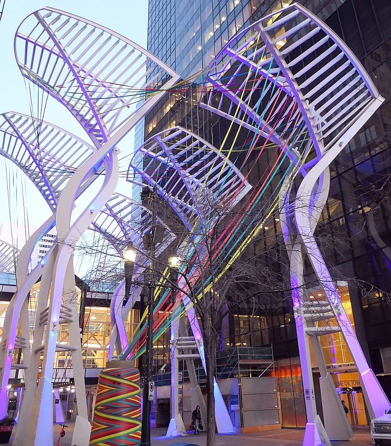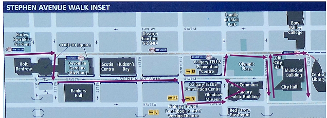 The map above shows the first stage of my morning inspection of the centre of Calgary. I walked three city blocks before I arrived at 3 Street SW and turned right. This took me down to Stephen Ave and immediately the buildings and the sidewalk started to look more decorated than what I had seen on my walk yesterday. To the right is a photo of a huge, colourful frame-work that covers a large section of Stephen Ave.