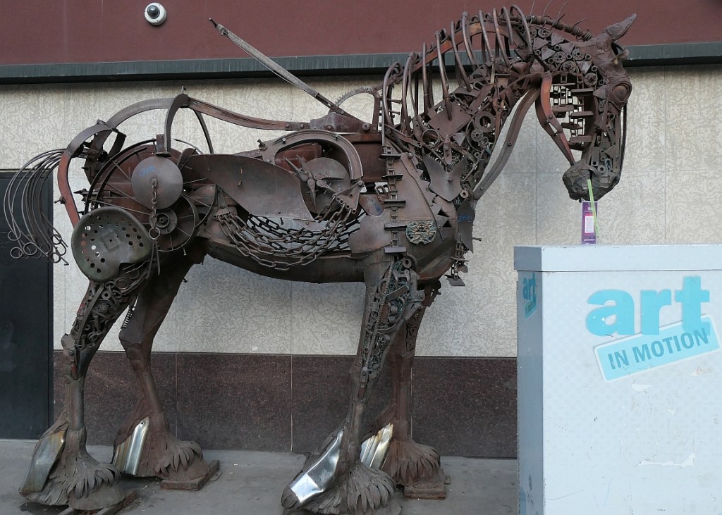 I must admit I was impressed with the large horse sculpture that was on the other side of the road from the Arts Common. The curious thing about the horse was that it was made from mechanical equipment and junk metal parts. It was a wonderful piece of art to slowly examine.