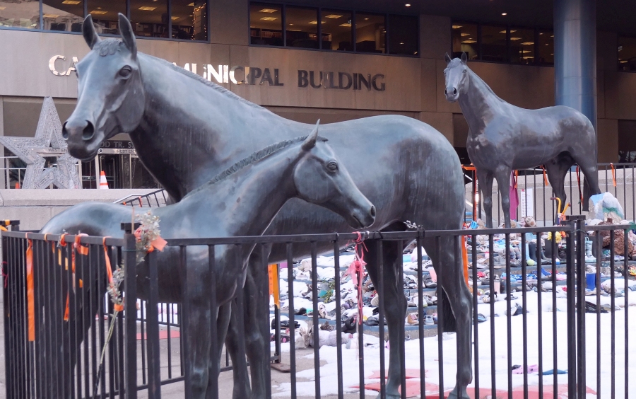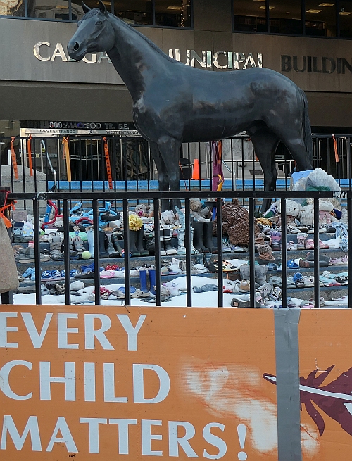 However horses weren’t the only objects on display outside the town hall. Scattered all amongst the horses were stuffed animals, hundreds of childrens’ shoes and a bicycle. It was apparently a temporary memorial for the victims of Canada’s residential schools. The City and Calgary’s indigenous and Metis communities have decided to work towards building a permanent memorial to remember the children who died in those schools. As is probably entirely predictable, this site had been a target for vandalism.