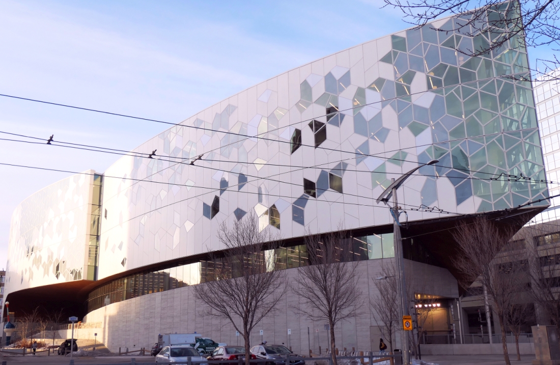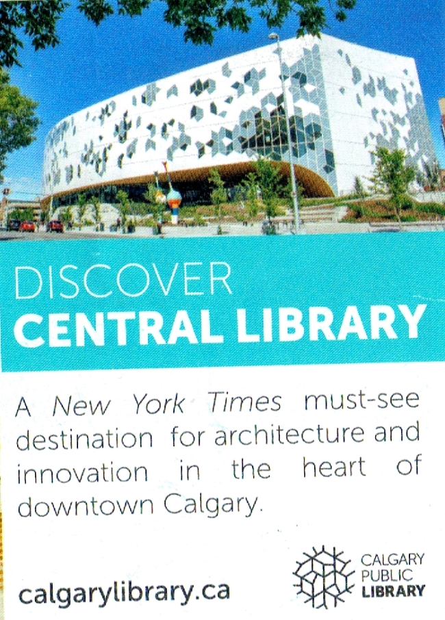 On this my first full day in Calgary, I hadn’t done a lot of research on the buildings of Calgary so while I was quite amazed by the huge white and blue building that sat around the corner from the Town Hall Railway station, I had no idea what its function was. I hadn’t investigated closely enough to realise it was the city’s new library and it had only been functioning as such for the last three years. If I had looked closely at my city map that I carried around with me, I would have noticed the small advert (to the right) that encouraged visitors to check out the library for its “architecture and innovation.” Despite my lack of knowledge about the gorgeous building, I walked along in front of it and made my way through a large group of teenagers who were gathered on the steps. One young lady with the group spotted me and decided I could be a quick source of cash for coffee so she approached me and asked me if I had any spare coins for a cup of coffee. Unfortunately I didn’t have any Australian or Canadian coins on me given that coins were of little use anymore in the modern economy! She wasn’t disappointed too much because she complimented me on my ski jacket that was keeping out the Calgary cold at the time!
