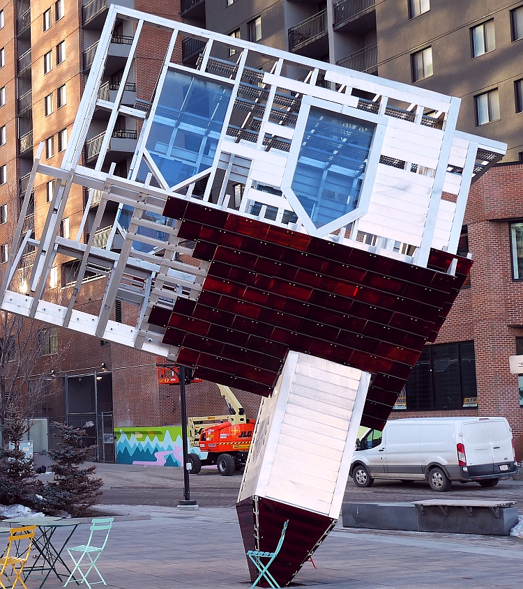 My original target for my day’s walk had been the Calgary Fort. It was situated on a large green space that was about three blocks away from the Town Hall. These blocks were residential and I was quite surprised to be passing one of these tall buildings when I noticed an upside down country church, gallantly not falling over on the tables and chairs that were gathered around it.