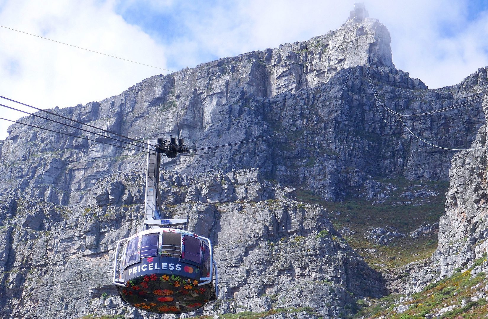 Table Mountain is described as an official ‘7 Wonder of Nature’ and its height is 1085 metres at its highest point. The cable car system that takes visitors to the top of the mountain is a spectacular piece of engineering in itself; each cable car can hold 65 people providing them with glorious views as the cable cars glide up the mountain. The cables themselves are 1200m in length, each weighing 18 tonnes. One curious aspect about the cable cars is that they carry 3000 litres of water in the base of each cable car as ballast during the windy season as well as being part of the supply of fresh water for the tourists up on the mountain.