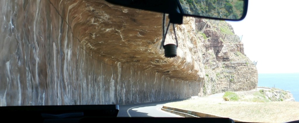 From Hout Bay our next destination on this Cape Town peninsula was the town of Noordhoek. The attraction of this section of the drive wasn’t so much our destination but the famous toll road, Chapman’s Peak Drive, that got us there. The publicity for this drive is that “it is one of the most spectacular marine drives in the world.” The image to the left here is an undercut into the cliff face to enable the cars and trucks to put sufficient distance between them and the cliff faces that make up one side of the drive. It is a road that was first built during World War 1 and has always been a controversial road due to its difficult location and the problems in maintaining the road from both man-made and natural disasters.