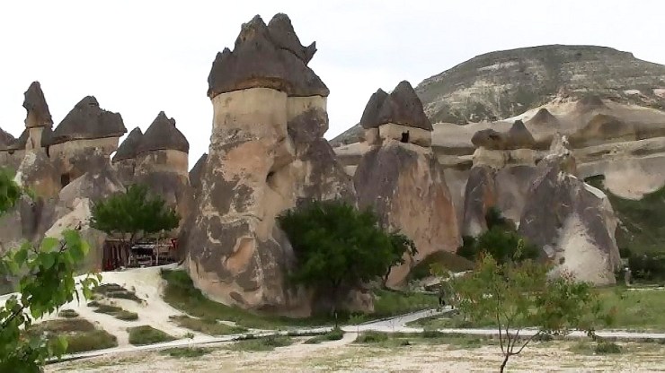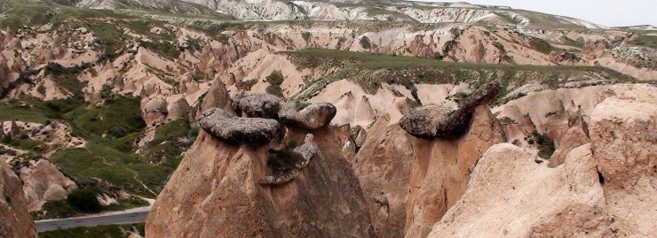 Part of our package in Cappadocia included a local guide for two days which meant that our movement around the key sites of the area was time efficient. Cappadocia is a series of valleys worn away by eons of time and weather leaving bizarre geological remnants that seem inexplicable when compared with some of the dull landscapes of our own dry continent. We were collected from Ayvali and driven northward past Urgup to a valley that is marked on the map to the left as ‘Pasabaglari’. The name seems to struggle with its identity as I found three versions of it so I will simply use the English version, ‘Monks Valley’. The ‘geological remnants’ referred to above are called ‘fairy chimneys’ here with multiple stems and ornate caps