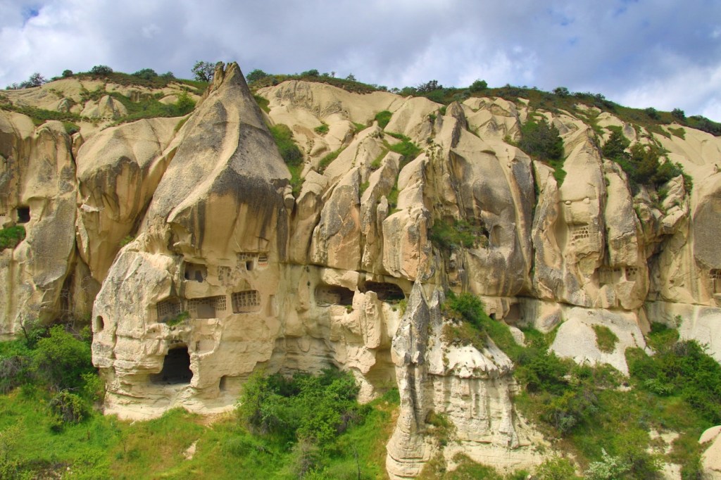 The image on the right below shows a side section of the Open Air Museum where the cliff face shows the evidence of another aspect of humanity’s need to dig out the rock walls of Cappadocia’s valleys. These are the pigeon lofts that locals have been building here and in other neighbouring valleys to attract pigeons to nest in places where their homes can be accessed. One key factor in this kindness to pigeons is to harvest their guano to fertilise the barren soil of the district.