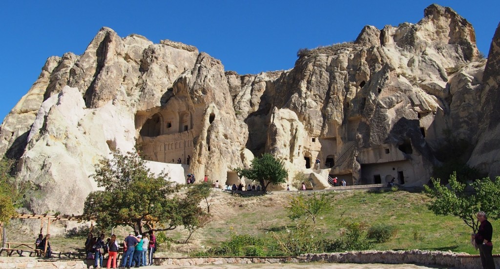 The history of the rise of Christianity is inextricably linked to Cappadocia, particularly the monastic movement. As mentioned in regard to churches and shelters dug out in Monks Valley, followers of St Simeon in the fourth and fifth centuries were prominent as well as those inspired by Basil the Great, Bishop of Kayseri. From the eighth century the monks and their monasteries had to resist the inroads of Arab invaders in the so-called Arab-Byzantine Wars and this was where underground shelters were expanded to protect citizens from these invaders. From the Monks Valley we travelled to the much more contained complex of the Goreme Open Air Museum. It is here that the impact of Christianity on Cappadocians can be seen most clearly as this is a site with nine churches gathered together, carved out of the same curving, weathered hillside. It looks like a monastic complex and there are eleven refectories (dining areas) carved into the hill sides to service the monks and nuns that would have been associated with particular churches at various times. However another theory about its overarching purpose, despite the many refectories, is that it may have just been a pilgrimage site for Christian travellers.