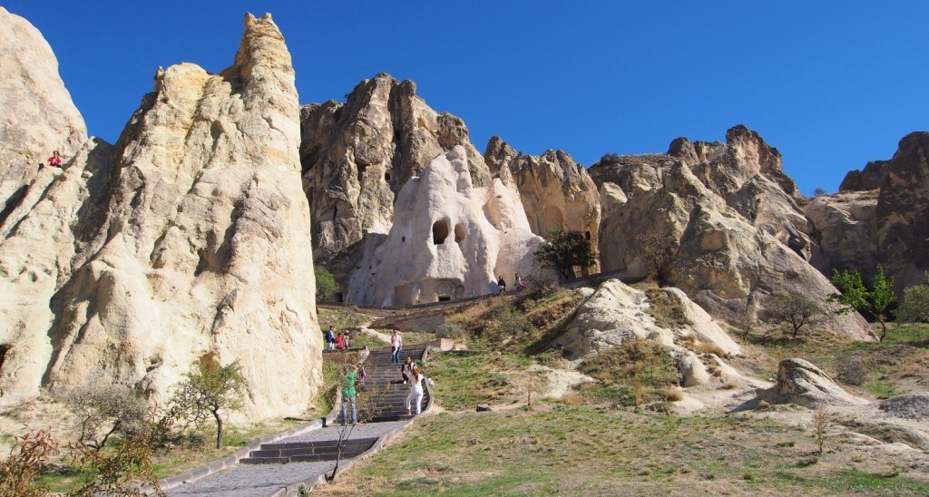 Humanity over the millenia has chosen not just to gaze in wonder at these stone chimneys but to also carve homes out of them. During the fourth and fifth century it become common practice for Christian monks to look for more demanding ways to self-isolate and pray, undistracted from the society of their less-driven towns folk. Retreating to the desert like Jesus was a response but a desert with rock pillars was even more popular with the local saints in Monks Valley. All the local tourist information about this valley refers to the large group of three chimneys that has rooms chiseled out of it as “Dedicated to St Simeon” (left image above). It is repeated so often that a casual tourist might believe that Simeon was local to the area.
