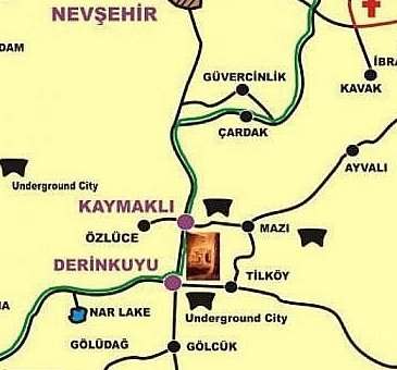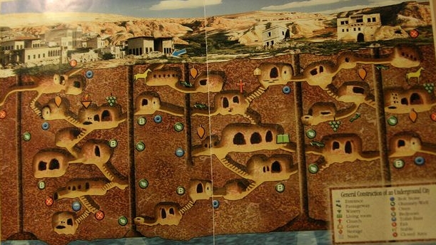 The map of underground Kaymakli to the left is an attempt to give some idea of the layout. This underground city has eight levels under the ground but only the top four floors are open for inspection. This diagram illustrates the ventilation shafts that were vital to ensure the flow of air through the underground rooms, particularly during long periods of sheltering.
