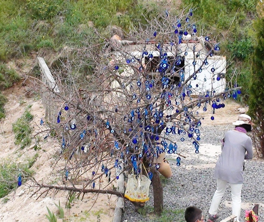 The town of Uchisar is dominated by the castle/mountain which is actually two giant fairy chimneys next to each other; the highest point at the north end is 100m. In Byzantine times the castle contained residences and monastic cloisters and probably held around 1000 people at the height of its population. It is no longer inhabited. It is also surrounded by fairy chimneys so the views around Uchisar are spectacular. Our guide stopped at a well-used viewing area that was approximately a kilometre away from the castle to take in these views. While we were there, we were joined by a not particularly handsome camel which we could ride for a small fee. The other thing that distracted my attention from the views over Fairy Chimneys to the castle was a bare tree without any vegetation next to the car park. Instead of leaves it was decorated by blue glass discs in the shape of eyes that apparently were very effective in warding off evil spirits. I am not normally a big fan of souvenirs, but I decided it wouldn’t hurt to carry some local protection with me for the rest of our tour. It still sits on my desk today and I have determined that it must be very effective as I have suffered minimal bad luck in my office since that time.