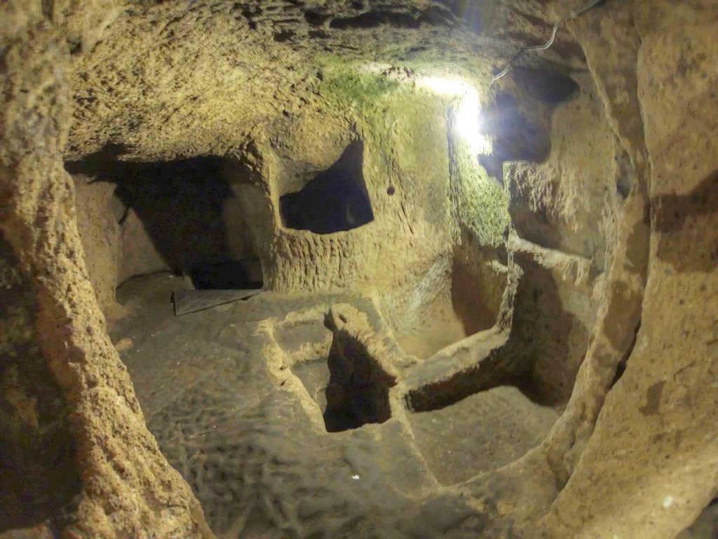 The locals not only needed to get their families into shelter, they also needed to get their essential animals under ground as they were vital for their future survival. Naturally, stables were on the first level below ground as escorting horses and other farm animals even deeper down narrow, steep passages underground would be very difficult. The image on the left above shows a Millstone Door in its niche, ready to close off a passage; these doors could only be moved from the inside. The underground city had more than one millstone door to close off passages further into the caverns to provide an extra level of security. On the second floor of the city is a church and the third floor is given over to the storage of wine, olive oil as well as kitchen areas