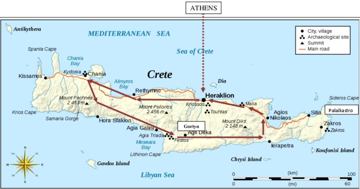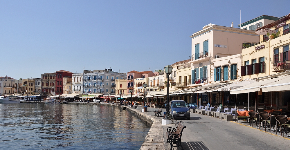 From the map below it can be seen that the route along the coast from Heraklion to Chania is reasonably straightforward. We were distracted by the sights of Heraklion on the morning of this leg of our Cretan travels and so, late departure meant that we decided we should skip Rethymno and go straight on to Charnia. This was a shame as this ancient city had a link with Australia during World War 2 (20–30 May 1941), when the Second Imperial Force combined with the Greek Army to resist the forces of German paratroopers that were attacking Crete. Apart from that connection it was a shame to skip another place with great views of the Mediterranean and a history that goes back to the Minoans.