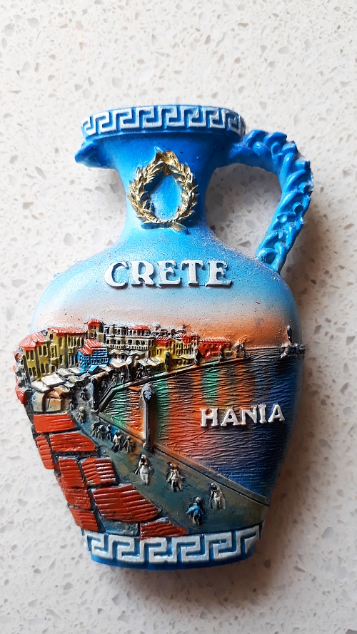 One of the things I generally don’t do when travelling overseas is to buy tourist ‘nicknackery’, but for some reason I changed my mind about this principle in Chania. The Chania jug to the right is still attached to our fridge, showing the paved shoreline that stretches along the front of the town, looking out to the Venetian Harbour wall and the lighthouse. We stayed three nights in this lovely place and an hour or two each late afternoon was spent having a drink on the edge of the harbour watching the sun set and the world stroll by.