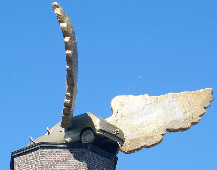 After examining the remnants of the Roman Wall, we now found ourselves opposite the city’s Kunst Museum and our guide drew our attention to the flying car on its roof. The building itself was the original armory of the city but had been converted to displaying art. The winged car was called Fleugelauto and it landed by crane in April 1991. Significant folk in the city objected to this ‘trash art’ and demanded it be removed but its popularity as a tourist attraction has given it the status of being “temporarily tolerated!”