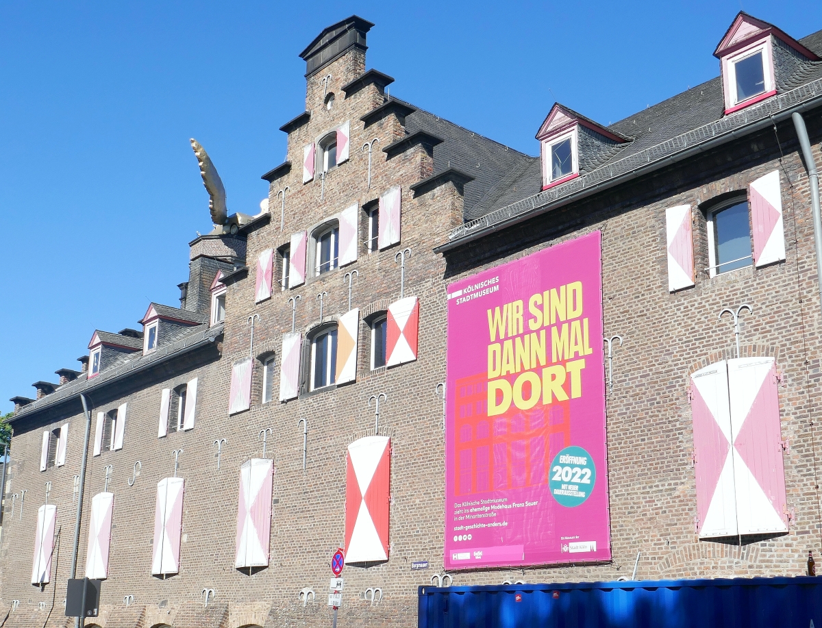 We continued along the street past the El-De Building and took a left turn down a street that was taking us back in the direction of the river. We stopped outside one of the houses in the street to read two brass plaques embedded in the paving. In our visits to Germany and other countries of Central Europe, we have become familiar with these brass plates embedded in footpaths in front of houses that were the last freely-chosen houses of Jewish citizens before they were deported or murdered. They are called “Stolpersteine” or “stumbling stones” and there are now more than 70,000 such memorial blocks across Europe and Russia. The programme of “Stepping Stones” has been described as the largest decentralised monument in the world.