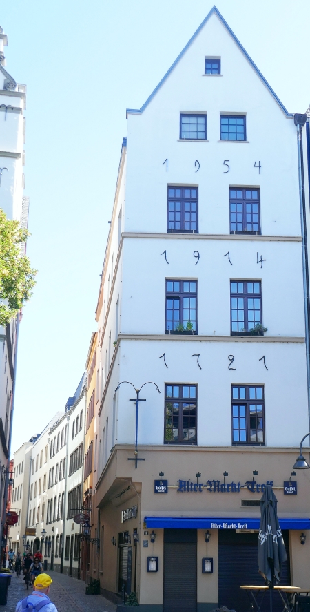 From the Rathaus we walked down through the Altermarkt and our guide pointed out one of the house on the edge of this piazza with three years inscribed on tits facade. These dates indicated the years when the house had to be rebuilt, the last one happening after World War 2 in 1954; the householder had to wait 9 or more years to get his house back after the wartime bombing.