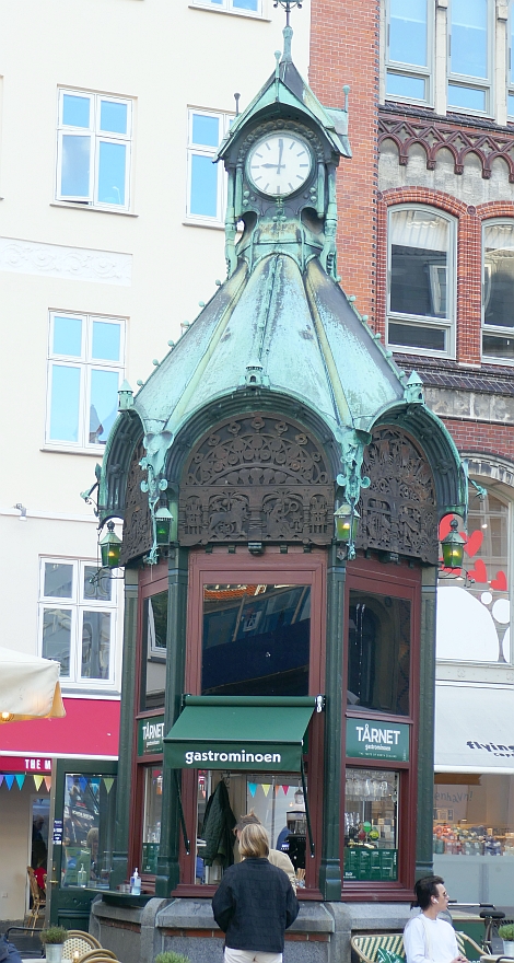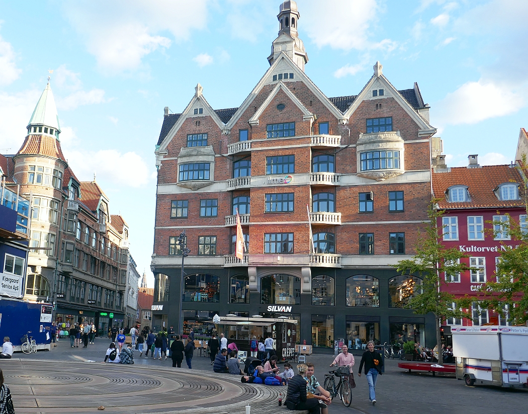 From the Round Tower we continued along Kobmagergade until we came to a large public square called Kultorvet (“The Coal Market”). This is a large square with shops and cafes around the edges. It is apparently a popular venue for outdoor concerts. Like the square where we had a beer earlier in our stroll (Hojbo Plads), this square was created after the Copenhagen Fire of 1728. In the image below on the left is a large shallow water feature which also doubles as a band stand when needed. I particularly enjoyed the old kiosk (right below); we encountered another one of these in a later square we strolled through.
