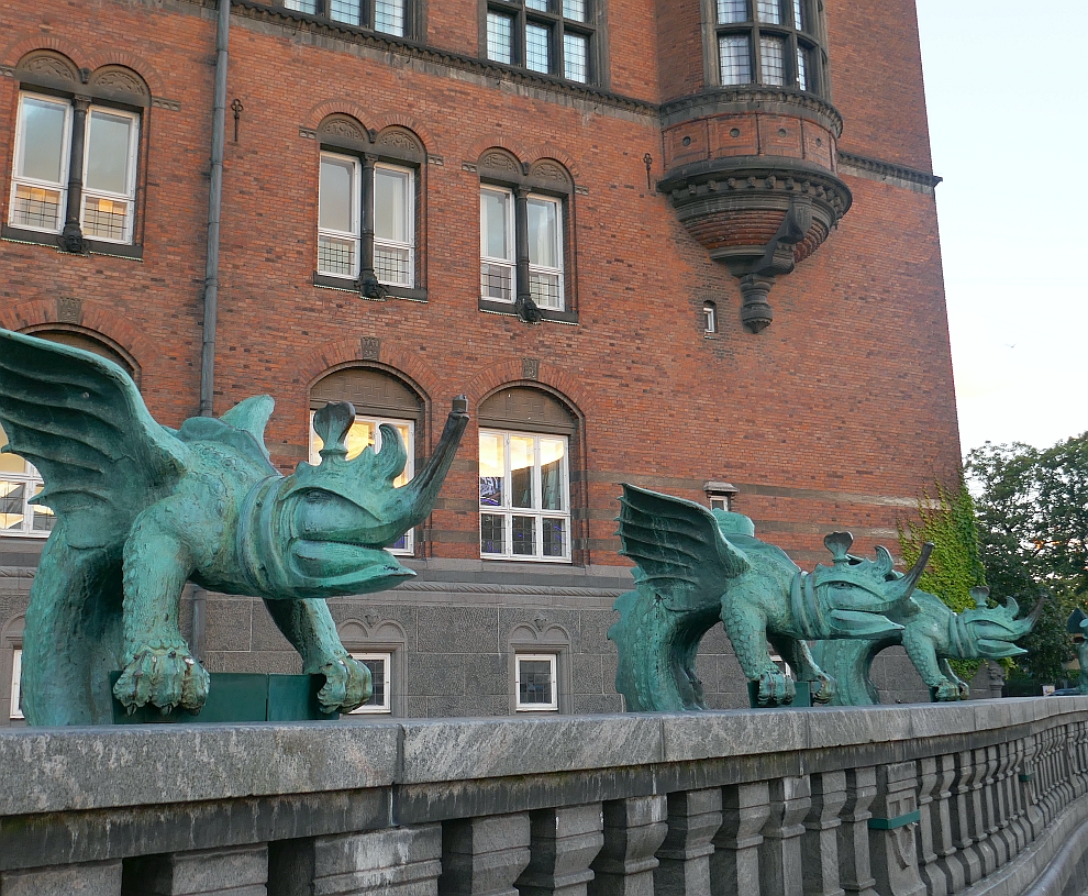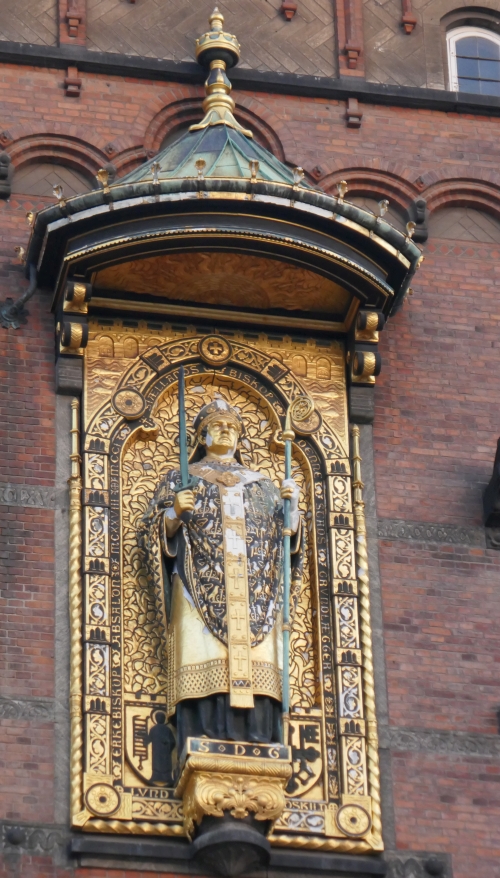 Copenhagen’s current town hall was built from 1905, replacing the 1815 Radhus that we also had passed on the way to this square. It was a very impressive looking building with a tall clock tower. The most interesting feature on the front of this building was a gilded statue in the centre over the main entry door. I didn’t realise at the time but when I checked the details of this statue later on, I had photographed another image of the city’s founding father, Absalon. Below the statue of Absalon, there were a series of statues that looked like the badly designed offspring of a late-night liaison between a dragon and an elephant. One suggestion was that they were placed here to warn off citizens with complaints about the local council.