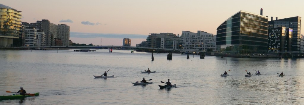 We were back on our route along the main canal not long after passing the Glyptotek. As we walked along beside the canal, we were rewarded with a lovely view of the kayakers heading back to their nearby wharf as the light slowly disappeared from the sky.