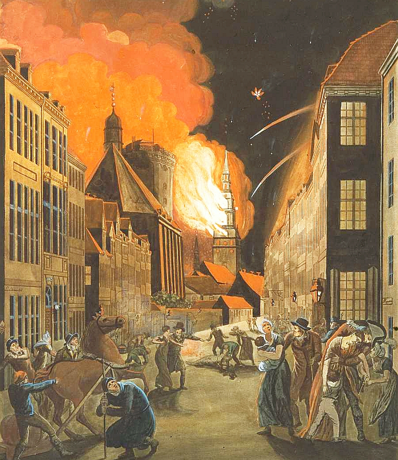 The image to the left is a painting by Chrtistoffer Eckersberg which shows the spire of the Copenhagen Cathedral on fire in 1807 and the university complex in danger of being burnt down (including the Round Tower). It is a great illustration of the dangers to citizens living in densely built cities like Copenhagen when the scourge of fire gets going