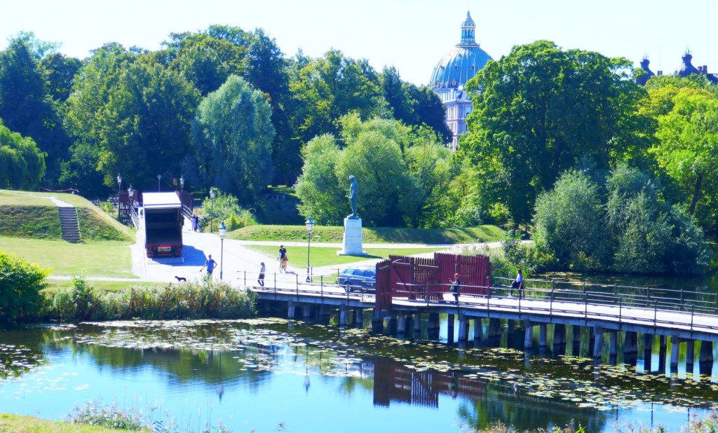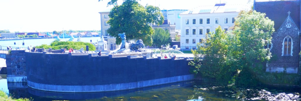 We entered the citadel and decided to go up on the walls and get a good view of the fortress and the surrounding area. In the first photo below, St Alban’s Church (the ‘English Church’), built 1885-7, can be seen on the bank of the waters that surround the Kastellet. The next photo looks back towards the harbour and shows a very impressive fountain that we missed inspecting up close. It is a large installation showing a group of oxen pulling a plow, driven by the Norse Goddess, Gefjon.