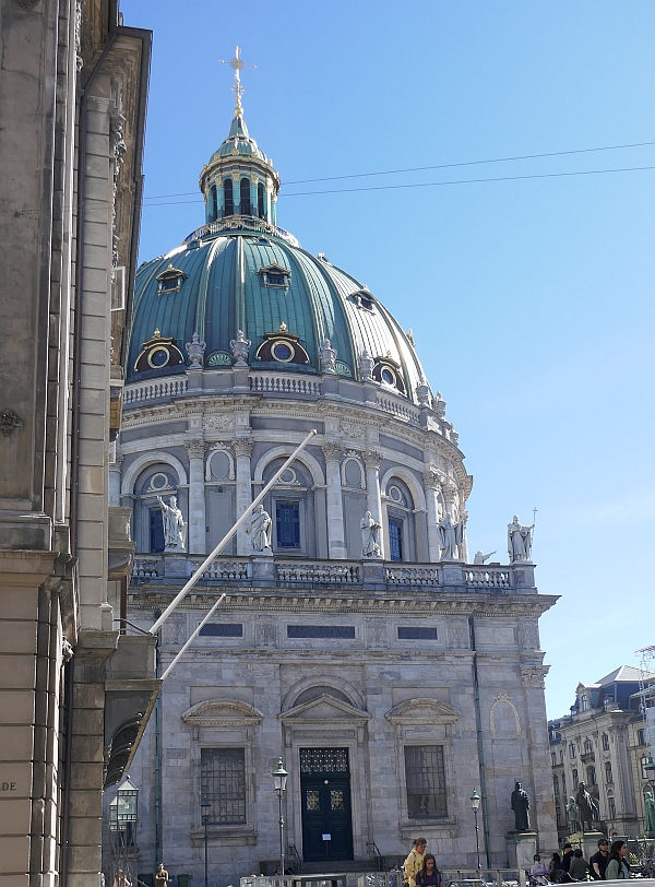 With no pre-planning on our part, we had arrived at the Amalienborg Palace complex just before the changing of the guard. There were large numbers of tourists in the courtyard at the time ready to photograph the pageant. I was surprised to see the ‘guards’ themselves had a number of local police guarding the guards from these inquisitive visitors. The church on the right in the photo above is called Frederik’s Church or the Marble Church. It is not part of the Amelienberg precinct and is in fact not made with marble but limestone blocks. It is a public church and is in high demand by young bridal couples in Copenhagen