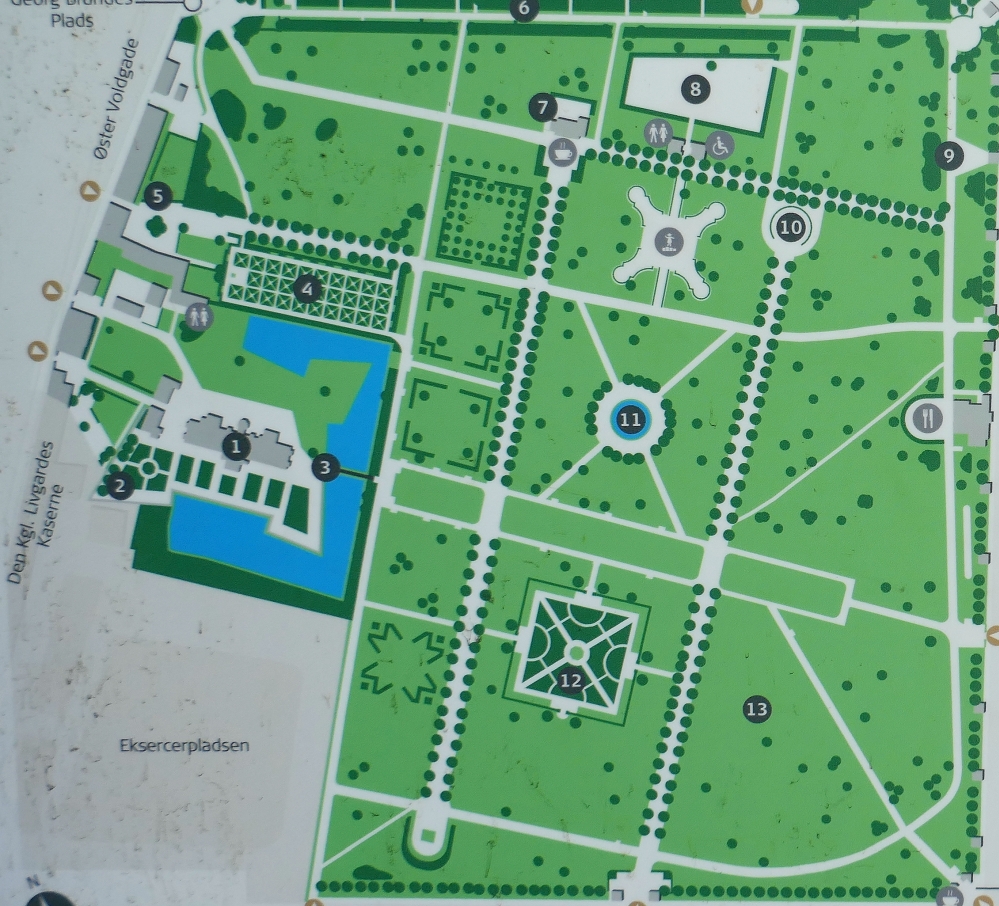 We were happy to arrive at the Rosenborg Gardens (‘Kongens Have’ in Danish, translated as the ‘Kings Garden) for many reasons, the primary one being there was a café here where we able to get a coffee and a bite to eat. The map to the right was the map at the gateway to these gardens and the knife and fork emblem on the right-hand side indicates where our café was. The large lawn area in front of us was very crowded with what appeared to be University-age students playing all sorts of park games in cheerful groups. We had no idea if it was a special games day at the start of the semester but they certainly were enjoying themselves. Some groups were playing a version of Fiska that for some mysterious reason we had adopted at home in Australia as a park game for family picnics
