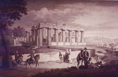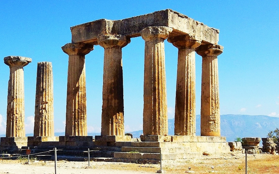 The images below give some idea of the survival process of what was left of the Temple of Apollo over the last four centuries. The painting on the left is from 1751 and shows 12 columns standing and the building situated on the temple’s platform behind the columns is most likely the residence of the local Turkish Bey. The image on the right is a photo from 1927 and shows only seven columns still standing. The columns that have gone missing since the 18th century may have been taken down and used in new buildings. The other reason may be damage from the earthquake of 1858. Around this time, the citizens of ancient Corinth would have moved to ‘New Corinth’.