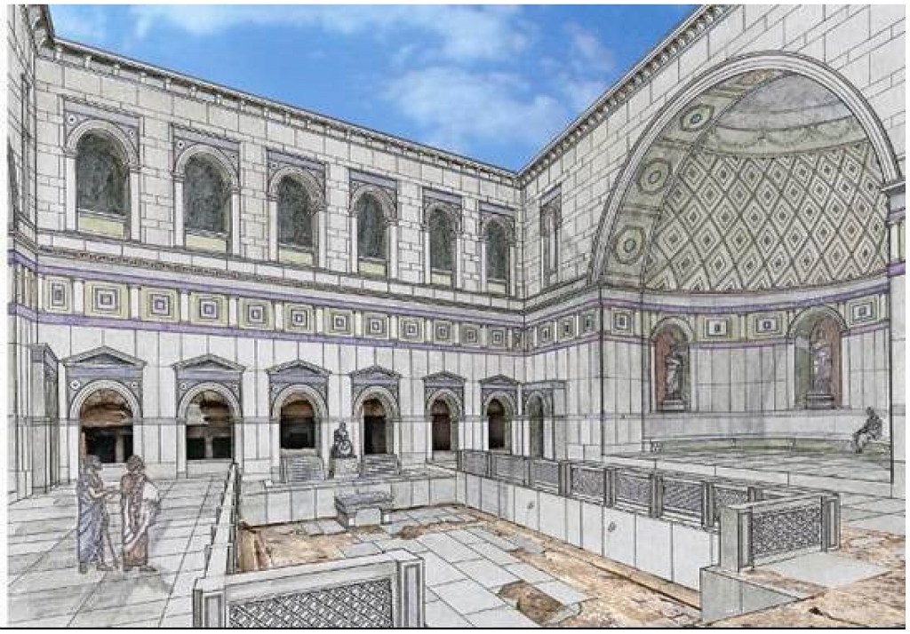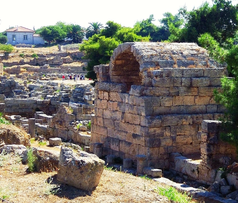The diagram below-right models what a section of ancient Corinth might have looked like during the Roman period. After inspecting the Temple of Apollo we continued on to examine the remains of the agora or market place on the right side of the complex. It was a large, generally open space surrounded by shops on each side and at the western end, a series of smaller temples dedicated to the likes of Hercules, Poseidon and Hermes. The photo on the left shows an arched remnant of one of the shops on the north side of the agora. There is not a great deal to see of the vibrancy of the original agora, unlike the description left to us by the traveller Pausanias who visited Corinth sometime between 143-161 CE. “In the middle of the market-place is a bronze Athena, on the pedestal of which are wrought in relief figures of the Muses. Above the market-place is a temple of Octavia, the sister of Augustus, who was emperor of the Romans after Caesar, the founder of the modern Corinth. On leaving the market-place along the road to Lechaeum you come to a gateway, on which are two gilded chariots, one carrying Phaethon the son of Helius (Sun), the other Helius himself. A little farther away from the gateway, on the right as you go in, is a bronze hercules…”