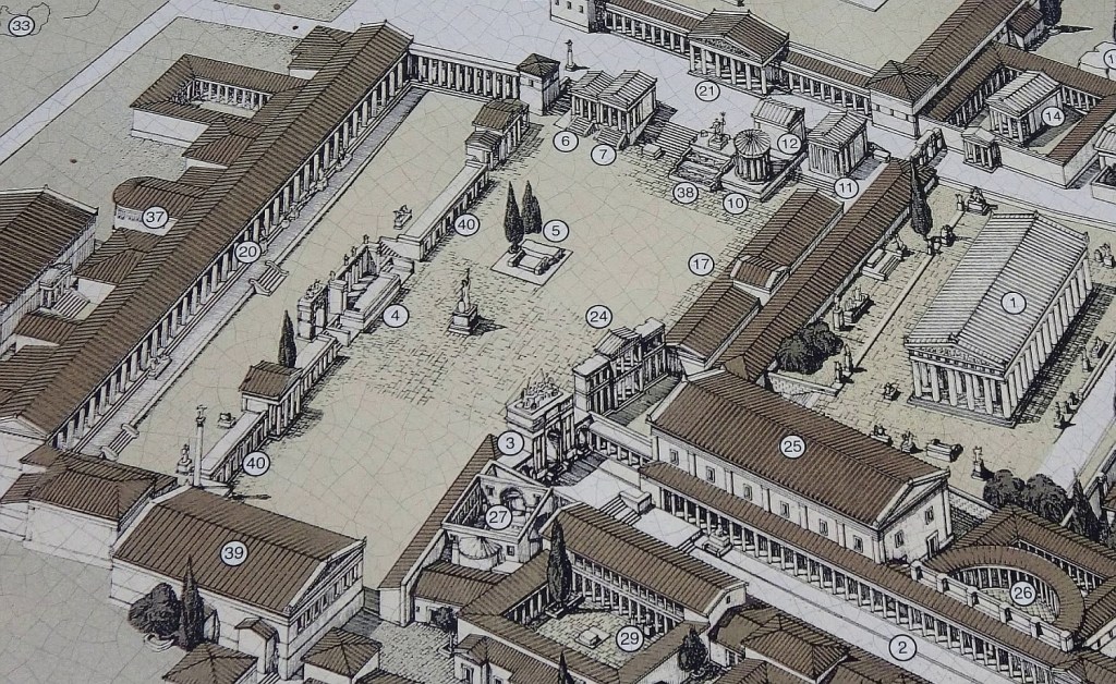 A nearby sign gave more details to add to Pausanius’s notes… “Human activity is attested in the area from the Neolithic period, and the first efforts of water management date to Geometric period (1100 to 750 BC)…by the 2nd century BCE, it consisted of six chambers providing access to three deep draw basins supplied with water by conduits excavated hundreds of metres back under the forum. The water was stored in four huge reservoirs.”