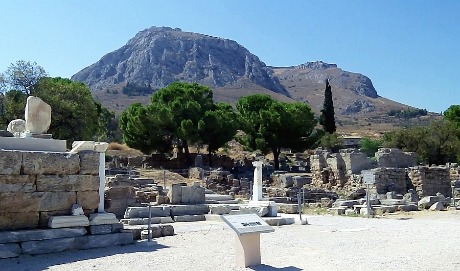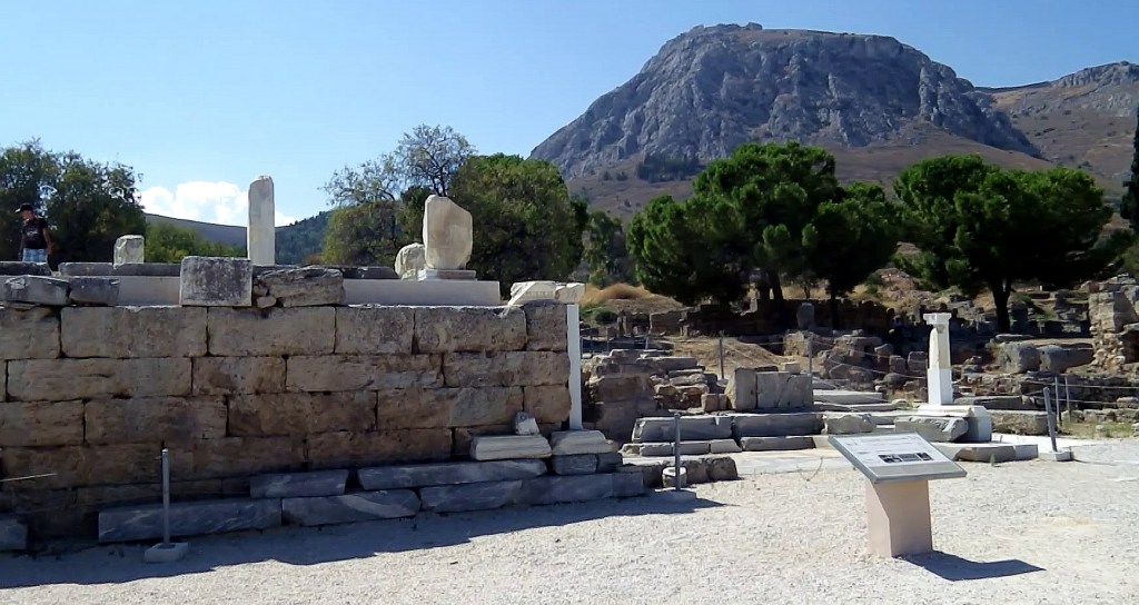 The ‘place of judgement’ mentioned above is in this agora and is called the Bema (Speaker’s Platform). It is an interesting experience to be close to the actual spot where Pausanius and St Paul, walked, talked and gazed with interest at everything around them. The image below of the remains of the Bema in the Corinth Agora captures the close up view as well as the Acrocorinth in the background.