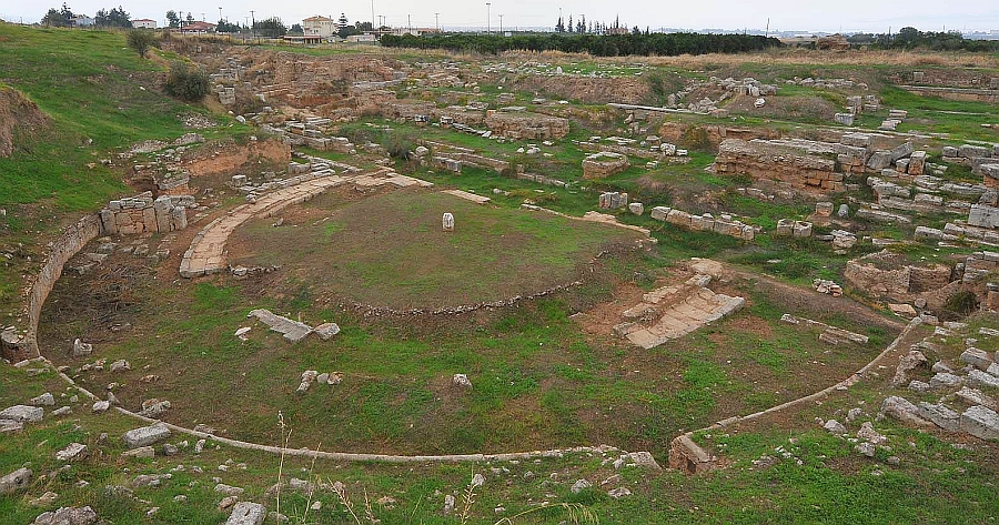 After strolling down to the edge of the Archaeological site, we had seen the major items on our guide’s list so we headed back to the Museum at the start of our trek. On the plan of the Corinth Archaeological site placed early in this article, it shows both an ancient theatre (4thC BCE) and an Odeon that were built on the other side of the site from the agora. These two places were not open when we visited there and if you look at what is left of the theatre in the photo below, you can see why!