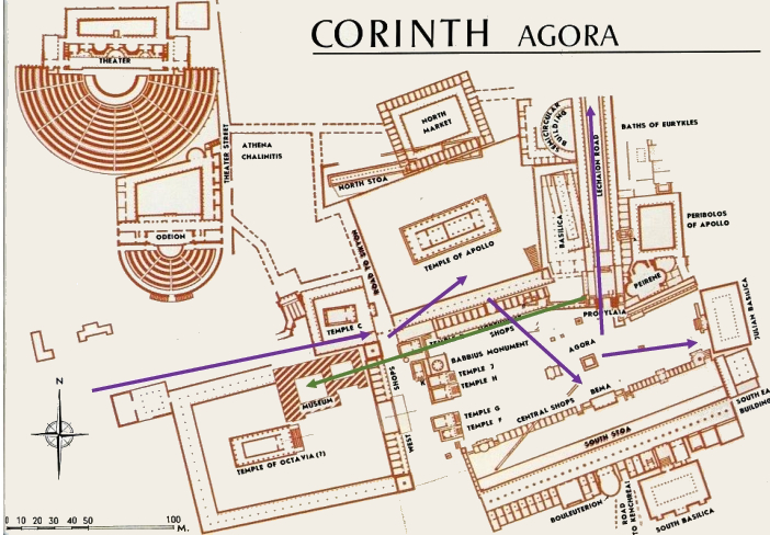 Another visitor who went to Corinth in 50/51 CE, earlier than Pausanius, is Paul of Tarsus. Paul was in town and presumably regularly in this agora, perhaps selling his tents with a couple of tent-making friends he made in Corinth. Chapter 18 of the Acts of the Apostles relates the story of some trouble Paul got involved in with some members of the local synagogue.