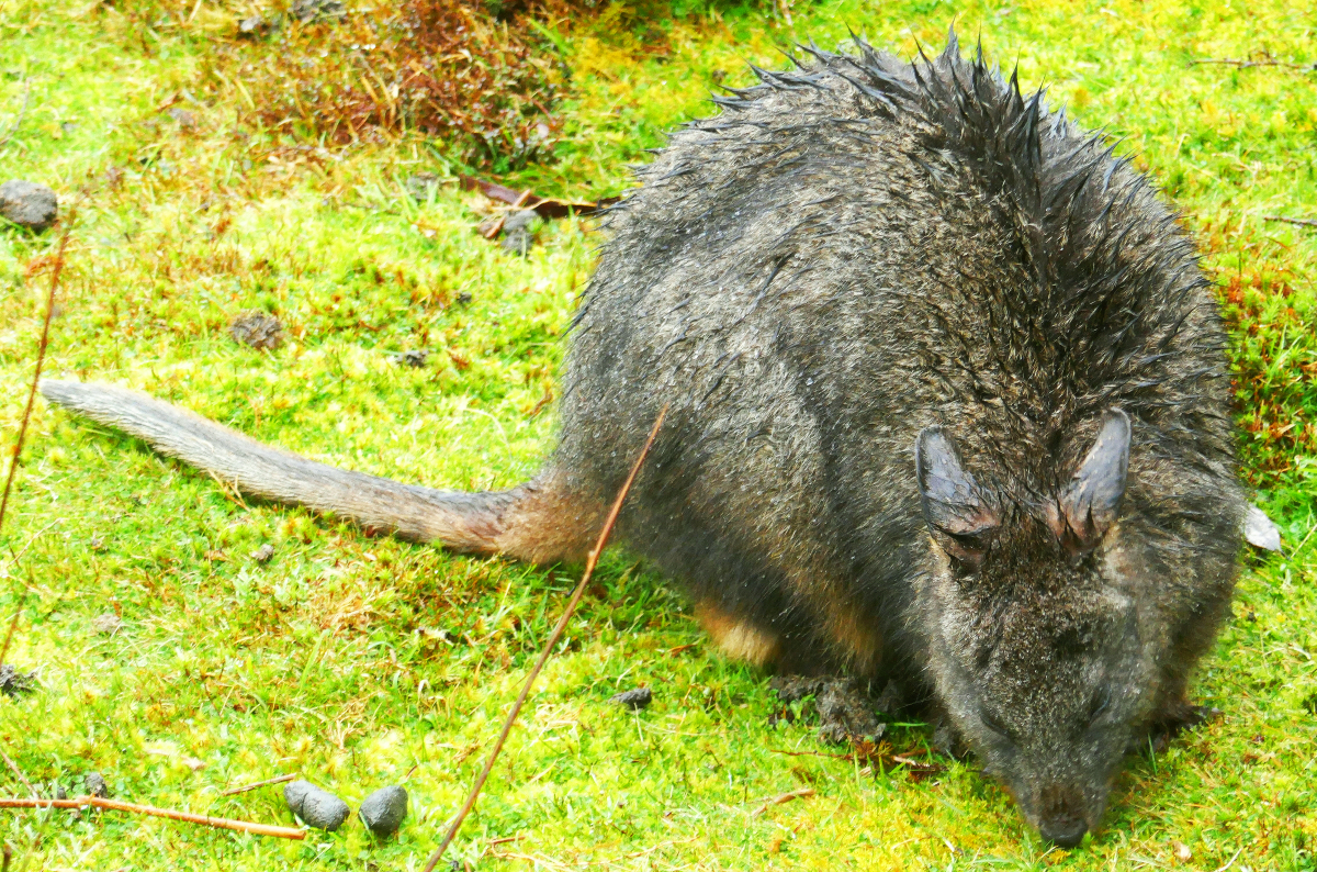 We eventually arrived at Ronny Creek, thrilled by our beautiful walk. Over the road from the bus shelter was the turn off to Waldheim as well the start of the overland track that takes hardy walkers up and around Cradle Mountain and onto Lake St Clair after five or six days of mountain walking. I decided to cross the road and have a look at the standing stones that marked the beginning of the track and tried to recall if this was the path I had followed 48 years before. All I could remember was a track that we had to hurriedly climbed before nightfall or we would have been out on own on a windy mountain with no cabin to provide some protection against the cold and the prowling possums. Distracted from these thoughts, I noticed a wombat trundling along beside the boardwalk and when I went to get a photograph, this marsupial quickly turned left into the bushes.