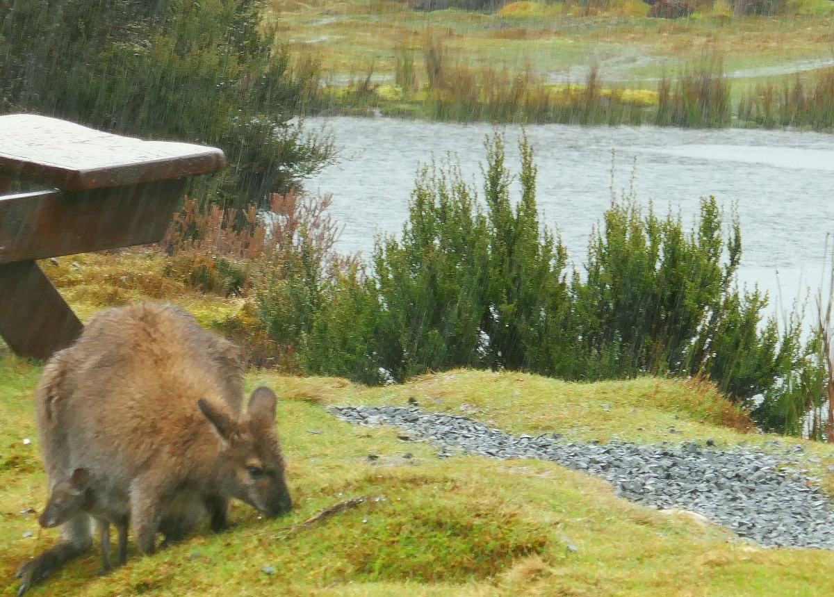 But by the end of our walk I believe we were offered more than the sign suggested. As we came out of the rainforest we spotted a very wet Pademelon grazing on the grass beside the track After watching him at lunch for a while, we headed up closer to Pencil Pine Creek and we spotted another grazing marsupial. It looked like a Bennetts Wallaby. It had detected our presence and was just sitting up straight keeping an eye on us. It then went back to grazing and we noticed it had a passenger, a small baby wallaby, half out of its mother’s pouch. This was a wonderful place, not just for the ancient scenery, but for the amount of native animals safely going about their business without fear of interference from visitors.