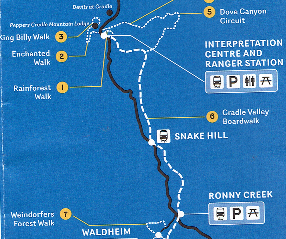 On our way back in the bus from Dove Lake we noted various bridges and boardwalks that were clearly part of another walk that tracked along the valley down-hill from the road the buses took. We were able to have a chat with the bus driver before we got off at the Information Centre who highly recommended it. He said it was best to start at the Interpretative Centre as the slope of the walk was mainly downhill from There.
