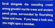 There are a number of Tasmania’s 60 ‘Great Short Walks’ around Cradle Mountain and I wasn’t surprised to find that the Enchanted Walk was another one. The text from the sign announcing that it was one of the great short walks is on the right. It was almost completely accurate in its description, particularly about the wombat.
