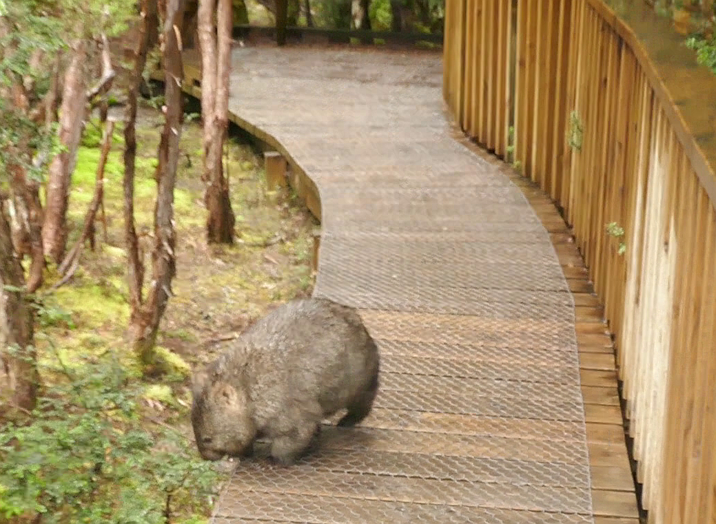 Encountering wombats had been a feature of our trip since we met our first wombat at the start of our drive up the Tamar River valley. However, the ultimate wombat encounter happened along this boardwalk not far into our walk. I was casually strolling when I heard a yell of surprise from Gayle who was a little ahead of me on the path. I turned the bend in the walk-way and there, shuffling along past her, was a wombat that seemed to be put out by the fact she was in his/her way as he went about his business keeping his feet dry on the boardwalk. I think the wombat thought he could ignore me by looking down at his paws as he headed back to his burrow but when I ducked back past him to get a better photo, he decided enough was enough and turned right, down off the boardwalk and scurried into the undergrowth. I read later that wombats can do up to 40Kms an hour if they need to.
