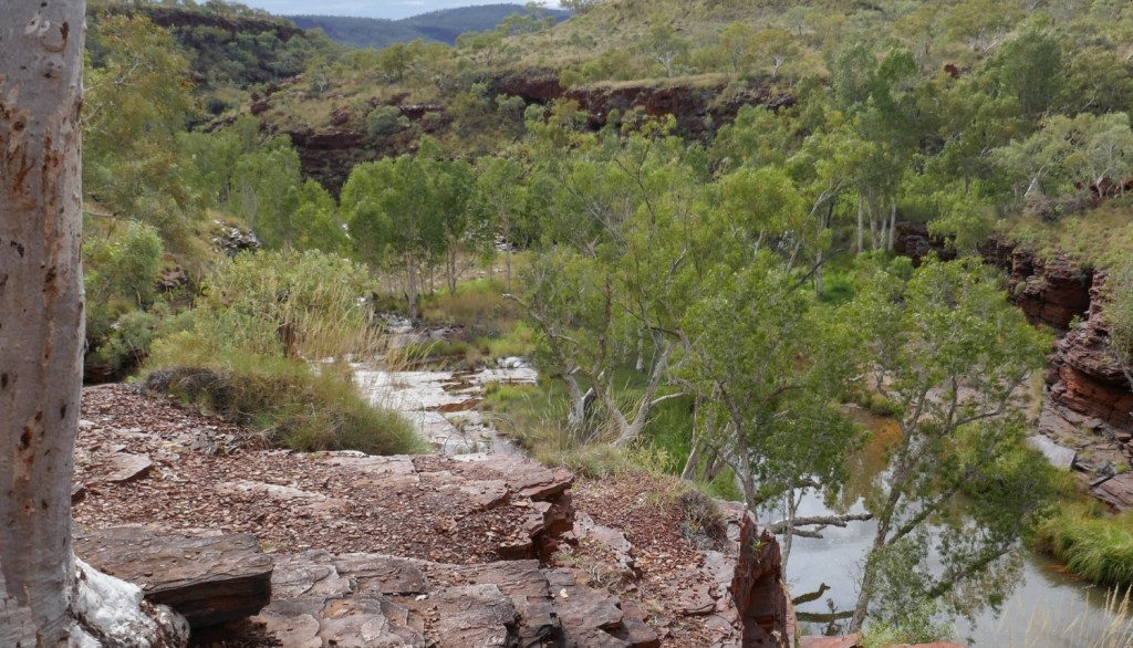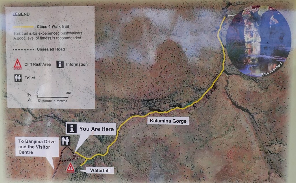 We were conscious that we had another gorge to visit that day and so we decided we would end our walk down Kalamina Gorge here. The map below shows that we missed reaching and exploring Rock Arch pool at the end of the suggested walk in this gorge. However we needed lunch to get through an even longer walk later in the day through Dales Gorge.