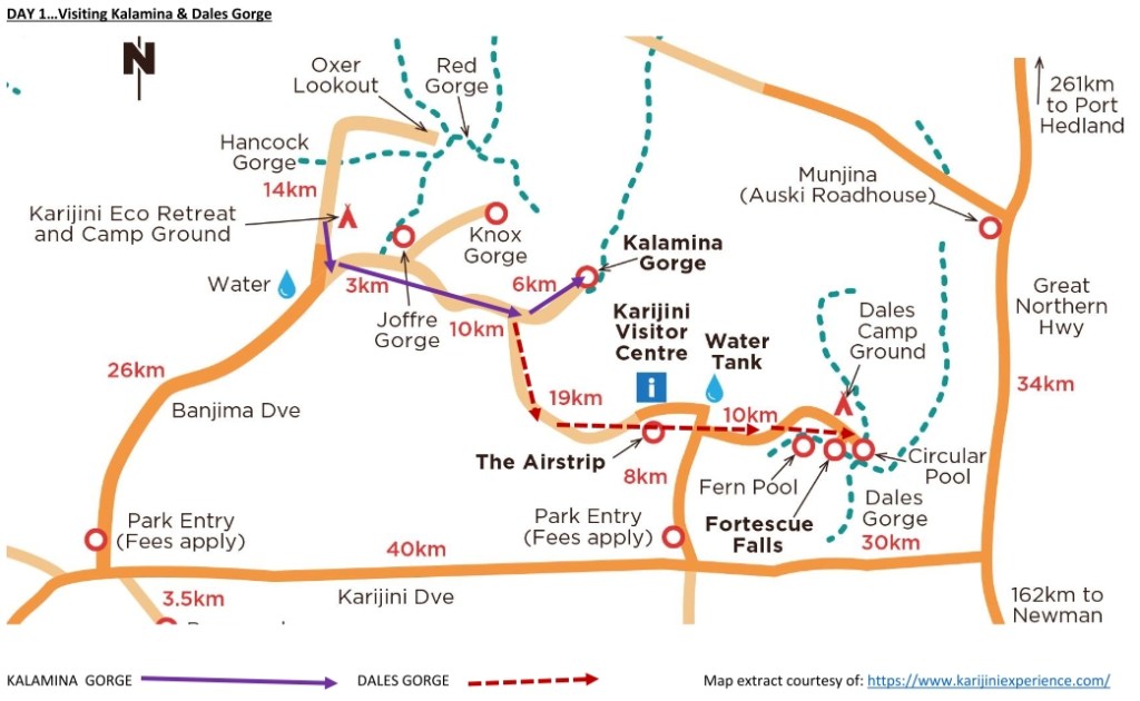 There were four of us in our family community that settled in a Karijini National Park and we were lucky on our first day of exploration to have a trusty four wheel drive wagon to take us to the different gorges around this extensive park. We had determined that Kalamina Gorge was our first destination and the map below shows our first trip was a 20 km drive out of the Eco Retreat site. The road between the Eco Retreat and the park’s visitor centre was a dirt road that was prone to severe corrugations and only suitable for 4WDs. We chatted to a Park Ranger later in the day and he told us that this road had only been graded two months before but it very quickly reverted to corrugations as its natural state. Our trip to Kalamina Gorge was dusty and bouncy but was worth the effort.