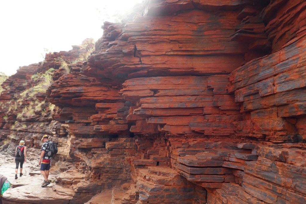 The other issue that was a regular feature of our walk was the extraordinary geological formations we came across in the gorges. In the case of Kalamina gorge, they stratified layers of the iron rich rock look so neat, almost as if we were in a stone mason’s yard where the pavers were neatly stacked.