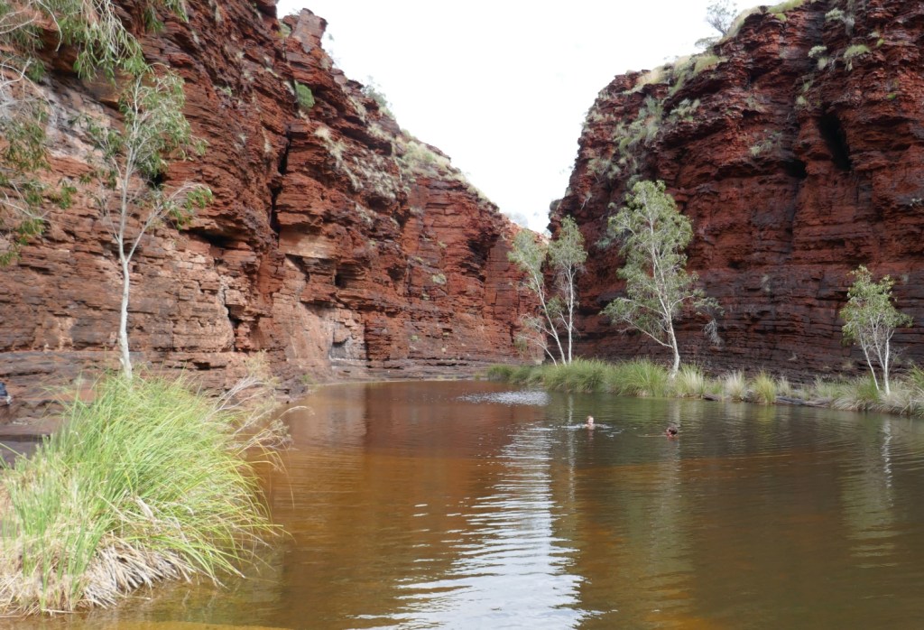 At the bottom of the entry walk into the gorge there is a waterfall and pool that set the standard for the scenery for the rest of the walk. One of the issues that arose over the rest of our time in Karijini when we came to these hidden pools and waterfalls was the wondering if whether these were sacred sites for the local First Australian people; they certainly seemed like that to us.