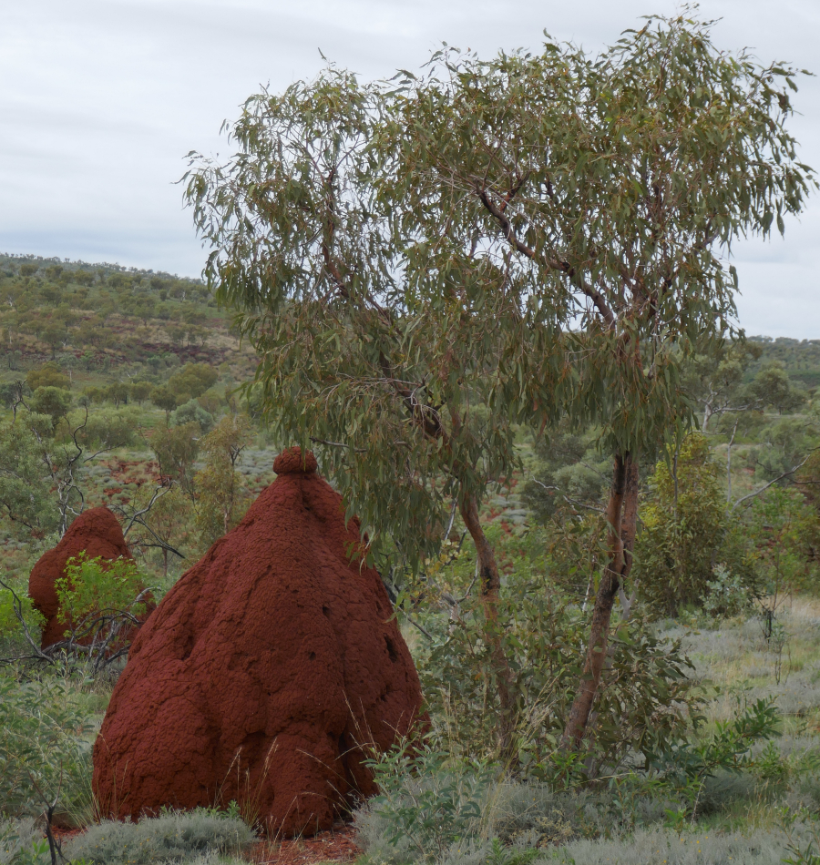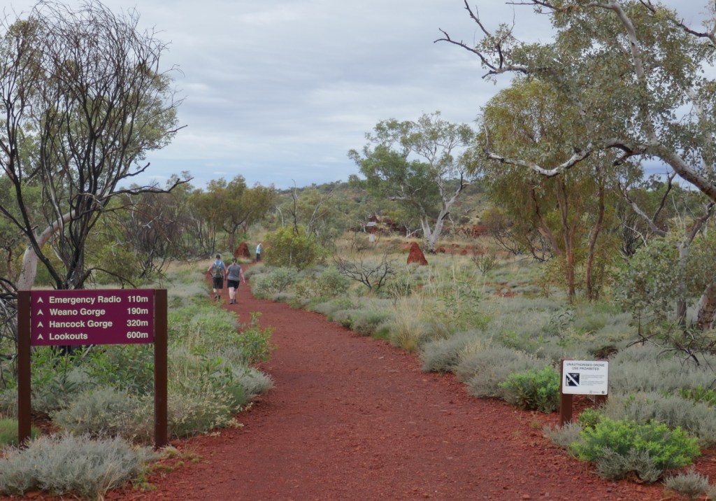 The first photo of the day below illustrates the start of our trek, the distances to walk and the termite mounds and the Snappy Gums we would be passing. There were two gorges we were headed for but I was only prepared to test my less than effective knee in one of them, Weano Gorge. My three companions would go on to Hancock Gorge with its perilous descent while I headed back to the car to journal and look forward to lunch.
