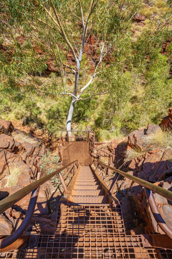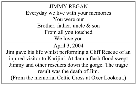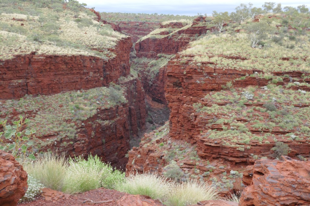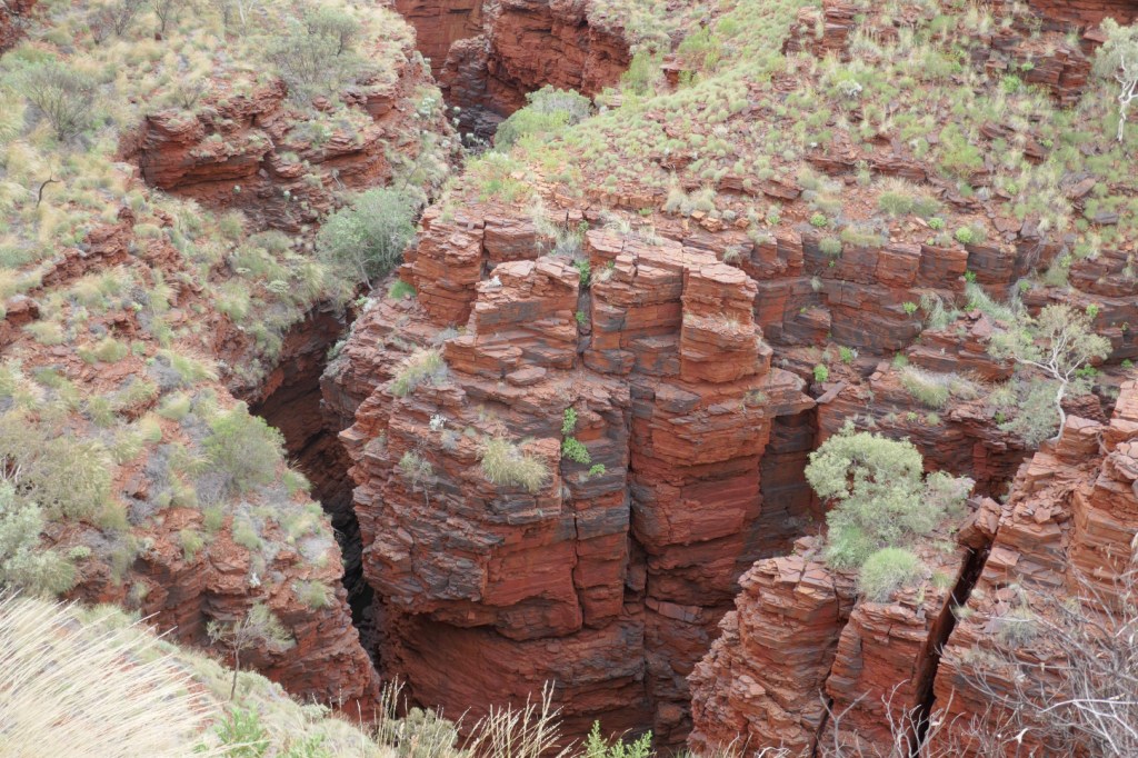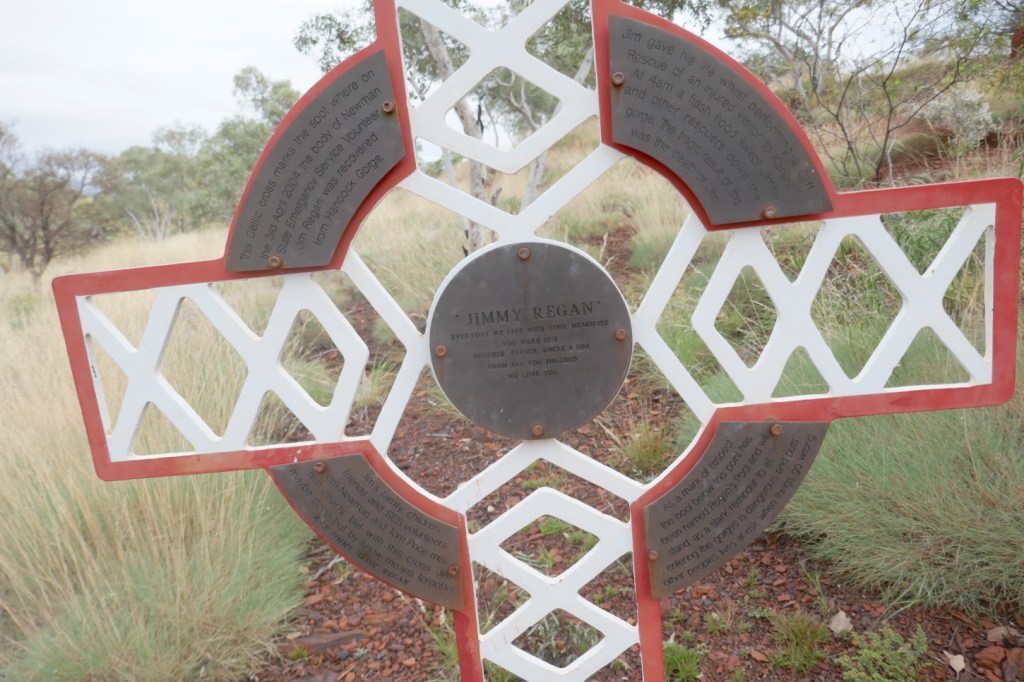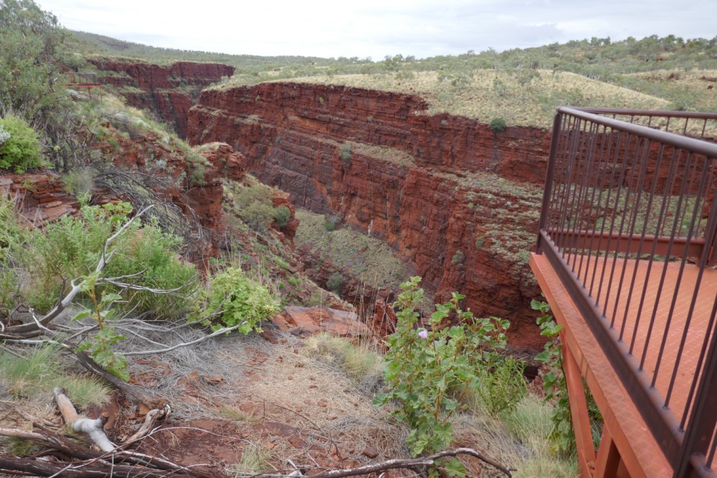 Not much further along the trail was the Oxer Lookout giving views down along Hancock Gorge. Before moving on to the viewing platform for Oxer Lookout, the visitors must pass the memorial to a park ranger who lost his life attempting to assist an injured visitor in 2004. This memorial should reduce some of the bravado of carefree Karijini Hikers, particularly if they consider they will be among the first people hoping today’s rangers will come and rescue them if they injure themselves in the gorges.