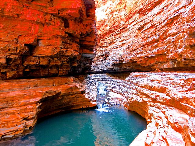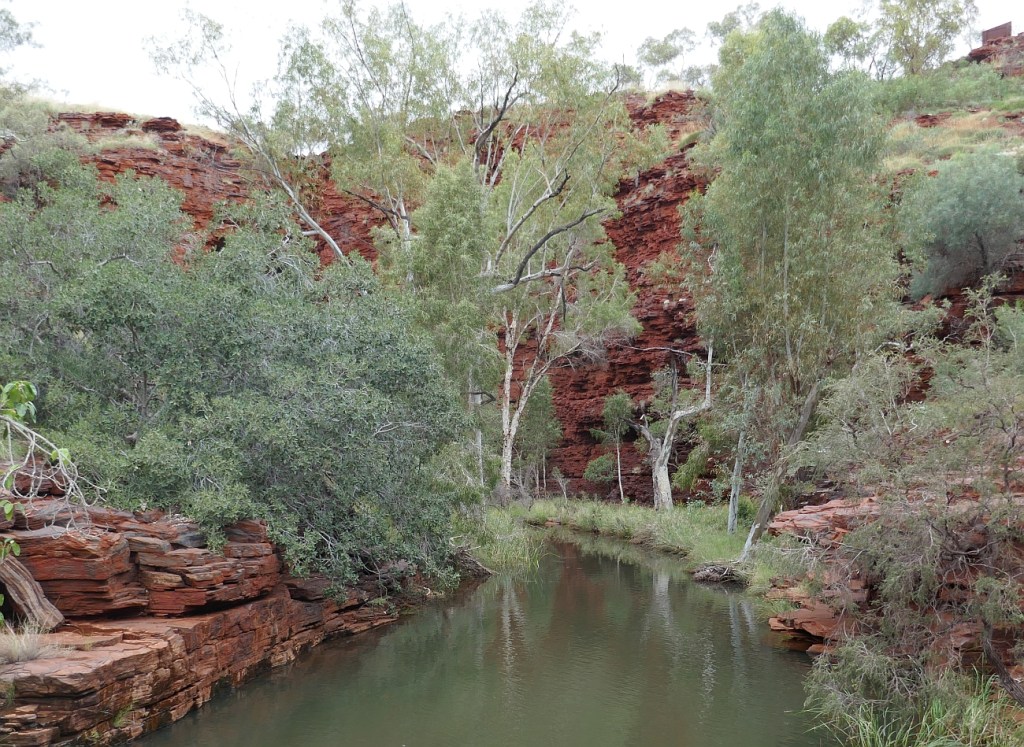 As the official photographer of our family group, I withdrew from the next section due to lack of physical agility; thus no personal photos of this trek. I had definitely decided I wasn’t a Class 5 walker and so took the warning signs seriously. For example, here is the advice of the local signage… “Hancock Gorge to Kermits Pool is one of the most challenging Class 5 trails in Karijini National Park. Many of the accidents in the park occur in this gorge and most are caused by lack of preparedness, inattention and poor choice in footwear resulting slips and fall, and failing to keep your hands free for balance.”