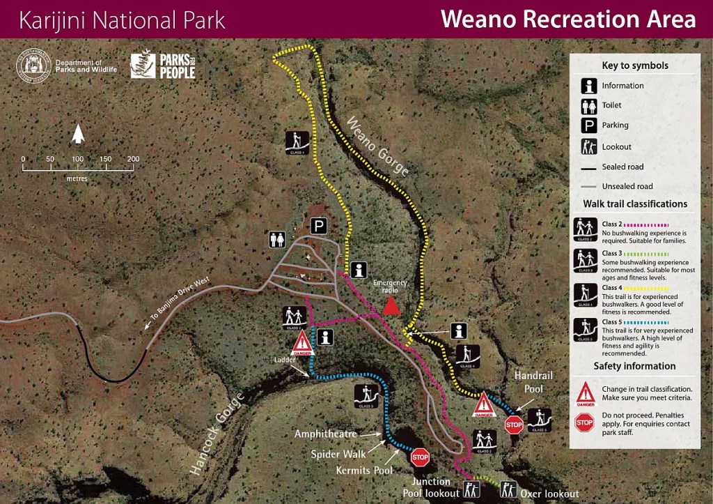 The photo to the left is of the last section of the ladder going down into Hancock Gorge. The map on the left above does show a photo of this section of the way down into the gorge and was a suitable warning for the ageing baby boomers that I saw at the top of this trail, wondering whether they would survive the walk down and the climb back up.