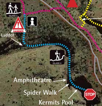 My three younger, fitter family members were able to make the descent down the side of the gorge successfully. I am not sure whether they had the change of footwear suggested in the park sign on the right! There was an abundance of well-produced signs at the start of this gorge that also included photos of successful hikers making their way through the last section (Spider Walk?) before Kermits Pool; I have printed two of them below.