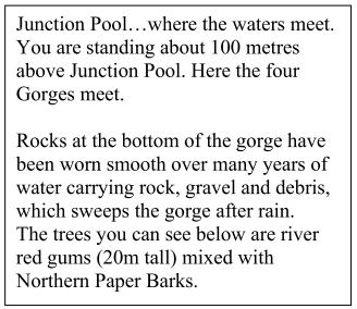Our destination to begin with were two lookouts where platforms had been built right out to the edge of the gorges to enable visitors to get close up and personal with the amazing views down into the gorges. The first of these was Junction Pool. The insert to the right below is a copy of the sign placed near the first platform.