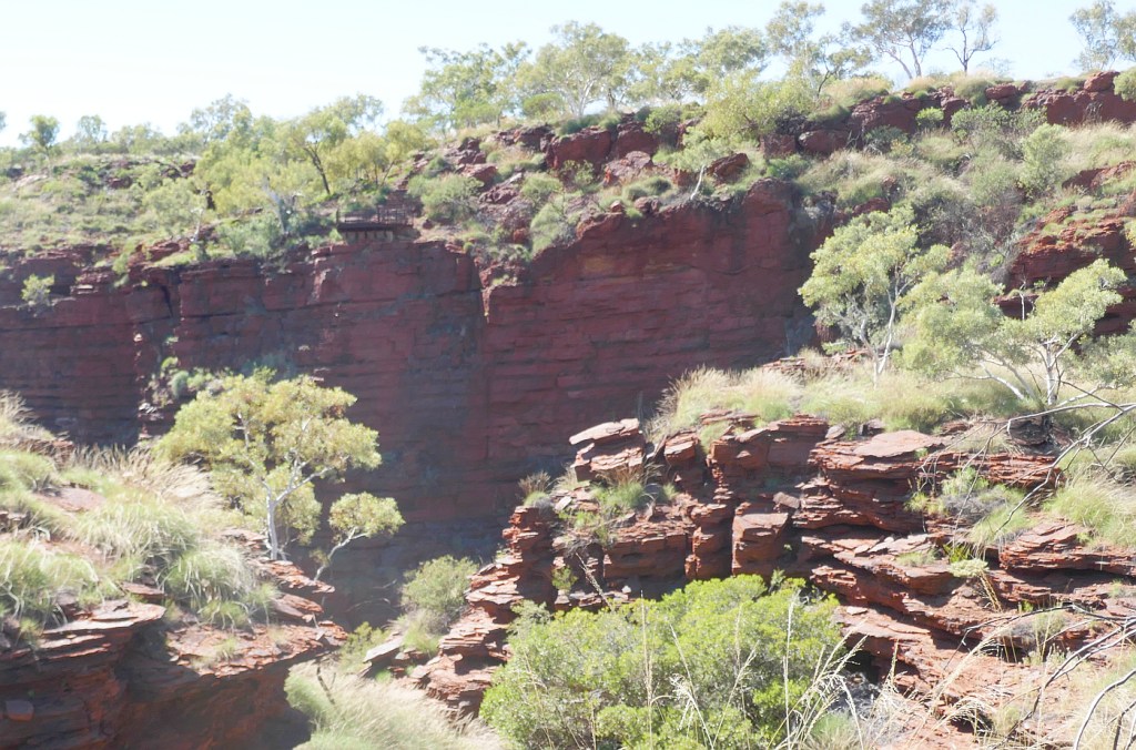 My walk back to camp from the viewing platform on the other side of Joffre Gorge was a piece of cake compared to my fellow travellers who had to climb back up the side of the gorge. The image on the left shows the hard work ahead of them after they had had their fill of sun-baking and waterhole swimming.